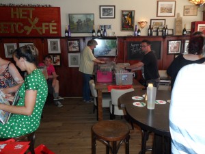 Na een korte, comfortabele doch warme reis arriveerden we bij het Eetcafé in een gloeiend hete Apeldoornse binnenstad. Hoewel de verleiding zeer groot was om meteen op het zonovergoten terras neer te ploffen en een meter bier te bestellen, zijn we eerst maar eens platen gaan scoren. Vanwege zijn functie als moderator was Jan al snel in gesprek met zo’n beetje alle aanwezigen. Wat meteen opviel was de ongedwongen ons-kent-ons sfeer en het feit dat overal tasjes met platen werden overgedragen