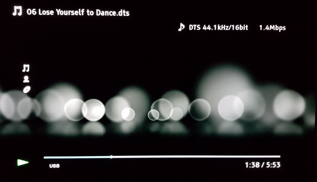 Als laatste luistersessie wil ik de meerkanaals-opname van Daft Punkt’s Random Access Memories (2013) beluisteren. De track Lose Yourself To Dance, veruit de beste track op het album, swingt over meerdere kanalen de kamer in. Het gefreak over de kanalen neemt toe op Touch die nog het meest weg heeft van een kruisbestuiving van Jean-Michel Jarre en Pink Floyd. De bitrate is 1,4 Mbps en de DTS-track klinkt zuiver en ontspannen. De achterkanalen hebben echt een toegevoegde waarde, het is leuk om favoriete albums uit meer dan twee luidsprekers te horen. Tijdens het browsen door de mapstructuur liep de speler vast, met geen mogelijkheid was de speler te activeren. Zelfs een power cycle lukte niet, dan maar rigoureus de stekker eruit.