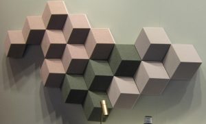 Shape serie gemonteerd. De Shape serie bestaat uit zeshoekige componenten die in willekeurige vorm aan elkaar kunnen worden bevestigd en als tegels aan de wand of het plafond kunnen worden gehangen. Doordat de in verschillende kleuren verkrijgbare fronten puntig zijn is het alsof je schuin tegen een kubus aankijkt. Dit geeft een prachtig driedimensionaal effect. De groepjes zeshoeken zijn prachtige composities die in het Haagse M.C. Escher museum erg op hun plek zouden zijn. Sommige tegels bevatten luidsprekers, andere Versterkers of dempingsmateriaal. In de luisterruimte werden filmfragmenten van Jumangi en Star Trek vertoond. Tijdens de laatste waande je je aan boord van de Enterprise. Door het overweldigende geluid van de rondom geplaatste Shape luidsprekers werd je met huid en haar in de vertoonde ruimteveldslag getrokken. In combinatie met het grote beeld echt een bioscoopervaring.